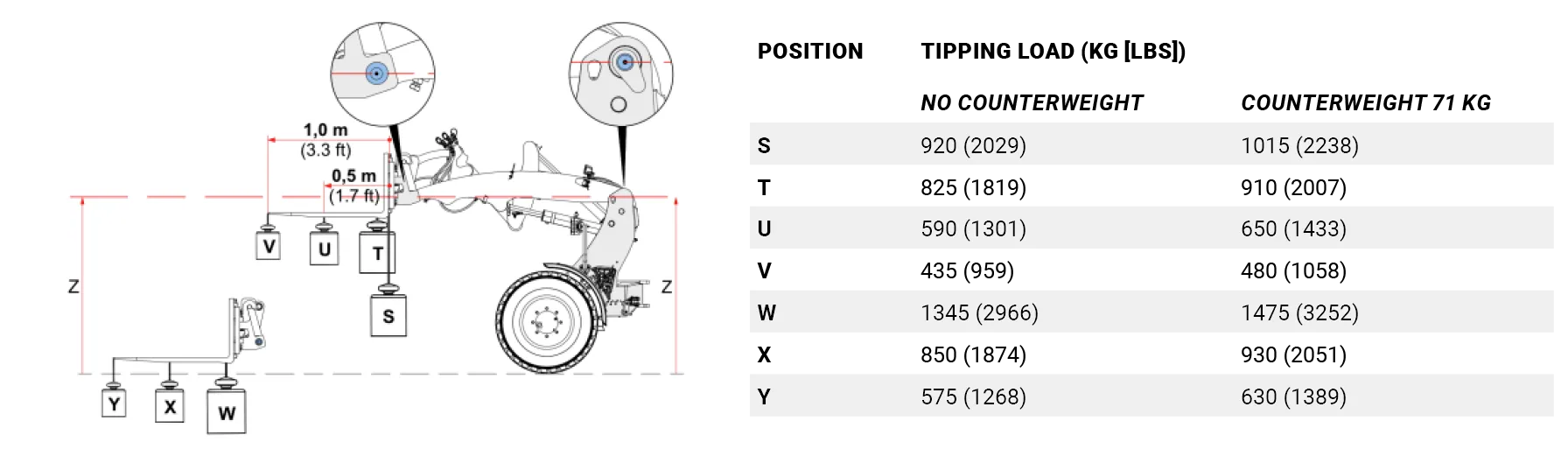 De tabel toont de kiplasten bij verschillende standen van de machine. De kiplast is het maximale gewicht dat de machine kan tillen terwijl deze stabiel blijft en niet kantelt. De werkelijke kiplast is afhankelijk van de configuratie van de machine, zoals diverse opties, aanbouwdelen en werkpositie.