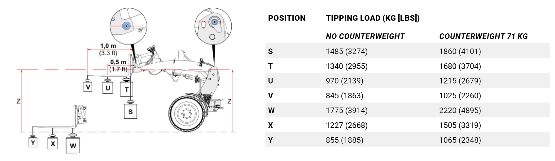 De tabel toont de kiplasten bij verschillende standen van de machine. De kiplast is het maximale gewicht dat de machine kan tillen terwijl deze stabiel blijft en niet kantelt. De werkelijke kiplast is afhankelijk van de configuratie van de machine, zoals diverse opties, aanbouwdelen en werkpositie.