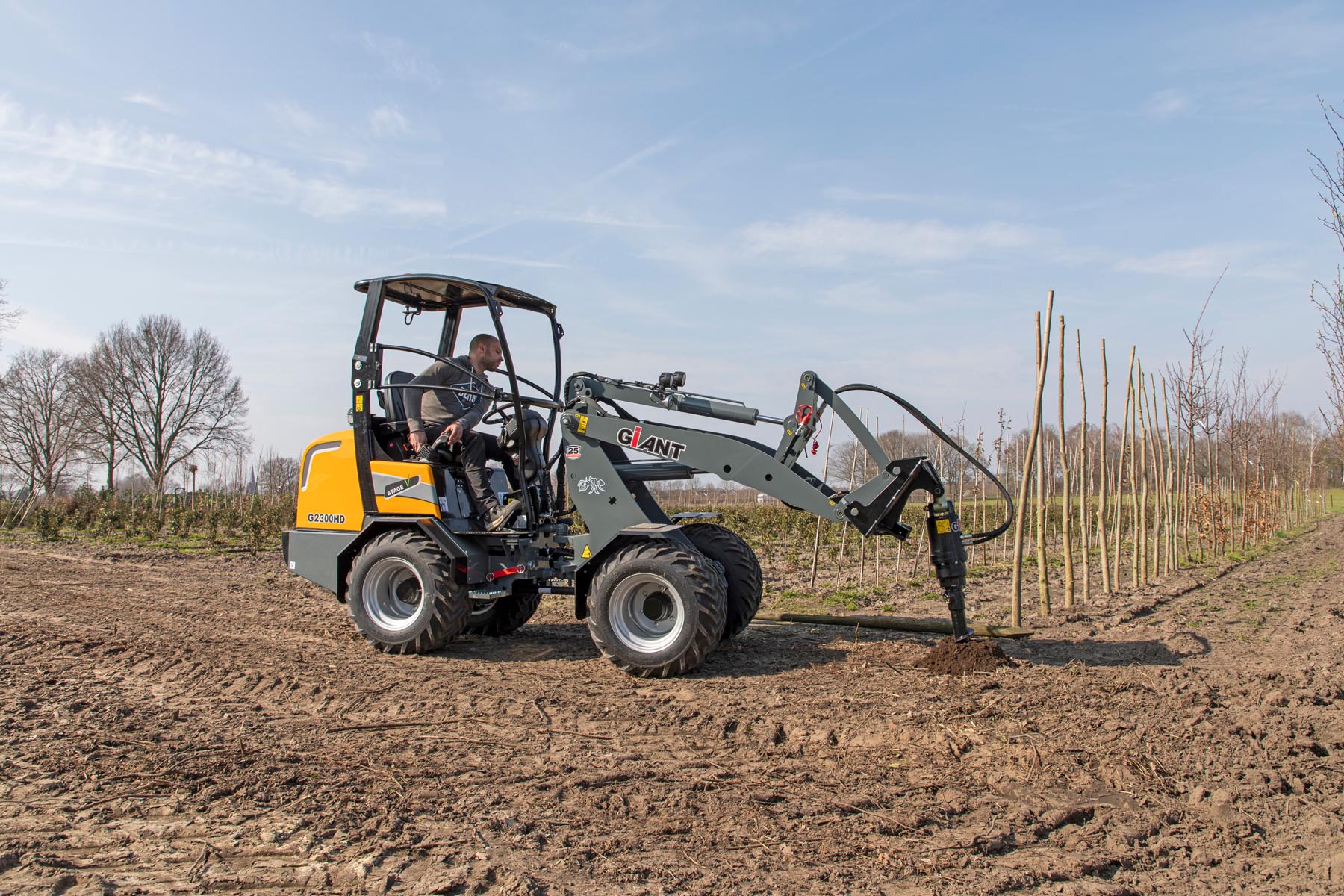 De Giant G2300HD is een krachtige 26 pk kniklader. Uitgerust met Heavy Duty 8 tons assen heeft de kniklader een hefvermogen van 1.650 kg en een hefhoogte van maximaal 2,8 m. De machine is breed inzetbaar, mede door het compacte formaat: 1,08 m machine breedte en 2,3 m doorrijhoogte. Het veiligheidsdak en geveerde stoel en halogeen werklampen maken de machine zeer comfortabel en veilig in elke werk situatie.