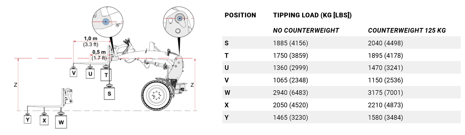 De tabel toont de kiplasten bij verschillende standen van de machine. De kiplast is het maximale gewicht dat de machine kan tillen terwijl deze stabiel blijft en niet kantelt. De werkelijke kiplast is afhankelijk van de configuratie van de machine, zoals diverse opties, aanbouwdelen en werkpositie.