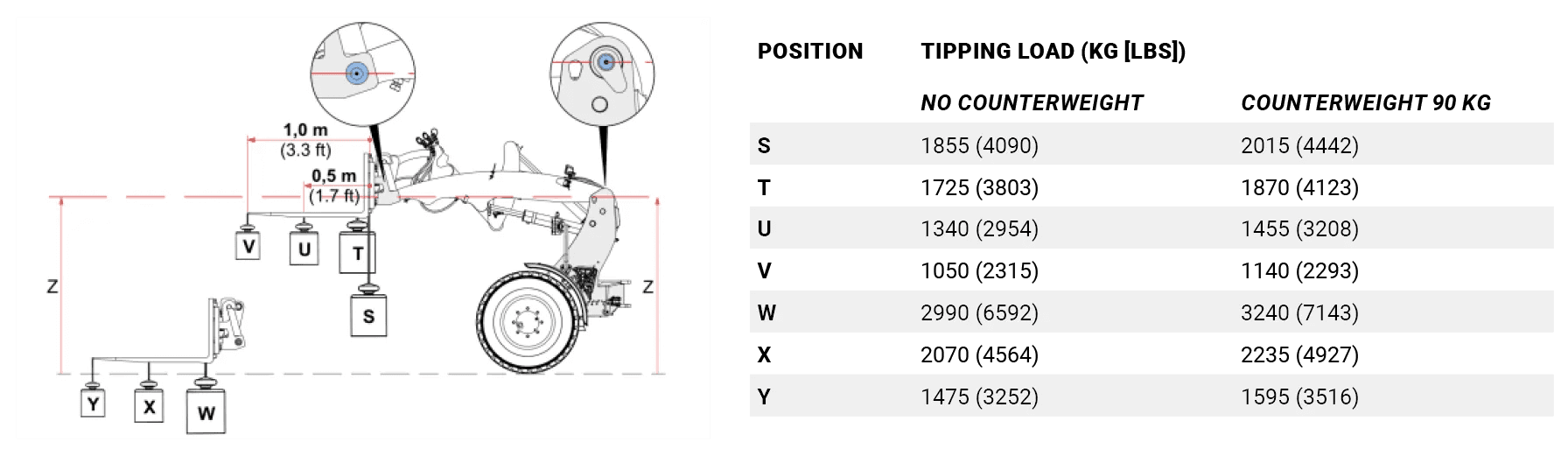 De tabel toont de kiplasten bij verschillende standen van de machine. De kiplast is het maximale gewicht dat de machine kan tillen terwijl deze stabiel blijft en niet kantelt. De werkelijke kiplast is afhankelijk van de configuratie van de machine, zoals diverse opties, aanbouwdelen en werkpositie.