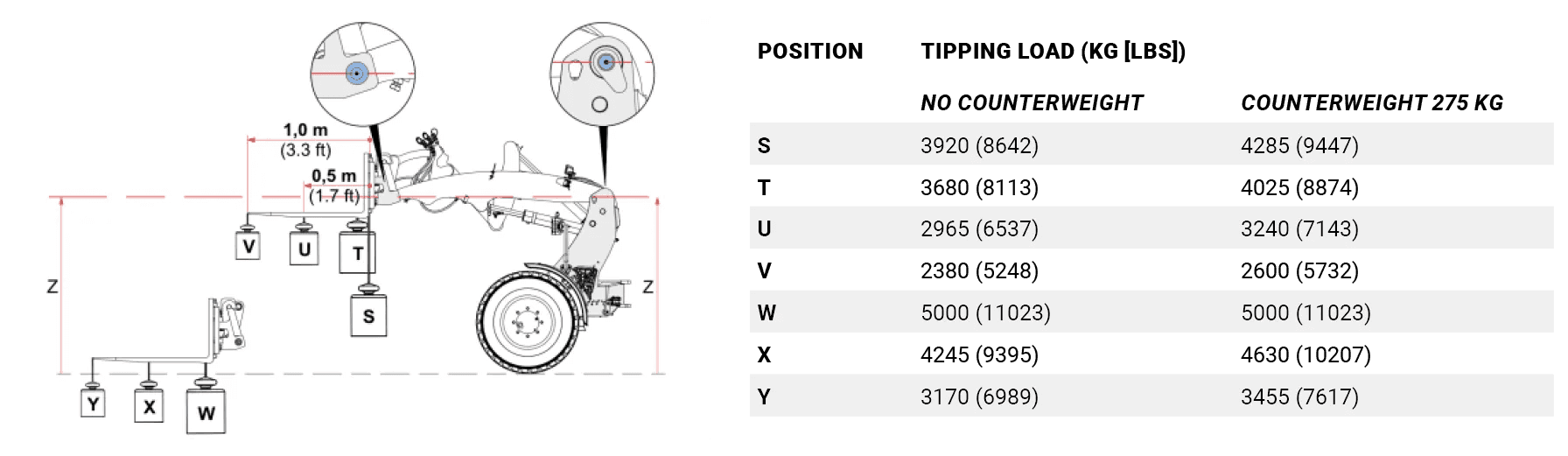 De tabel toont de kiplasten bij verschillende standen van de machine. De kiplast is het maximale gewicht dat de machine kan tillen terwijl deze stabiel blijft en niet kantelt. De werkelijke kiplast is afhankelijk van de configuratie van de machine, zoals diverse opties, aanbouwdelen en werkpositie.