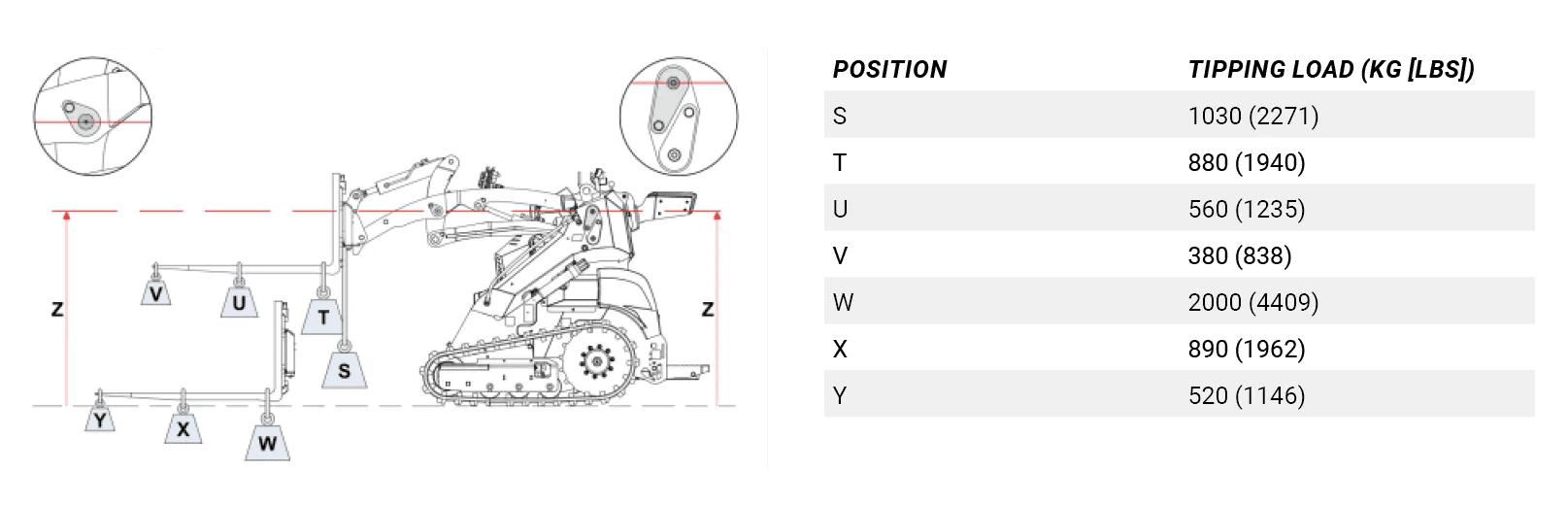 De tabel toont de kiplasten bij verschillende standen van de machine. De kiplast is het maximale gewicht dat de machine kan tillen terwijl deze stabiel blijft en niet kantelt. De werkelijke kiplast is afhankelijk van de configuratie van de machine, zoals diverse opties, aanbouwdelen en werkpositie.