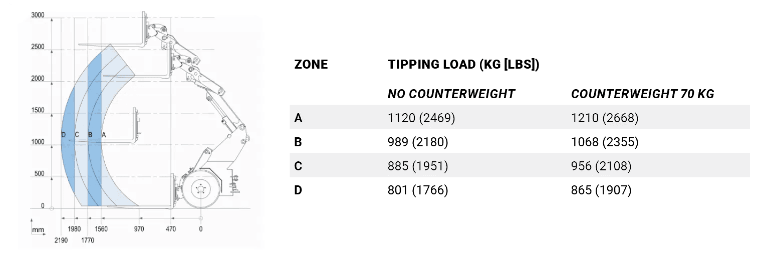 De tabel toont de kiplasten bij verschillende standen van de machine. De kiplast is het maximale gewicht dat de machine kan tillen terwijl deze stabiel blijft en niet kantelt. De werkelijke kiplast is afhankelijk van de configuratie van de machine, zoals diverse opties, aanbouwdelen en werkpositie.
