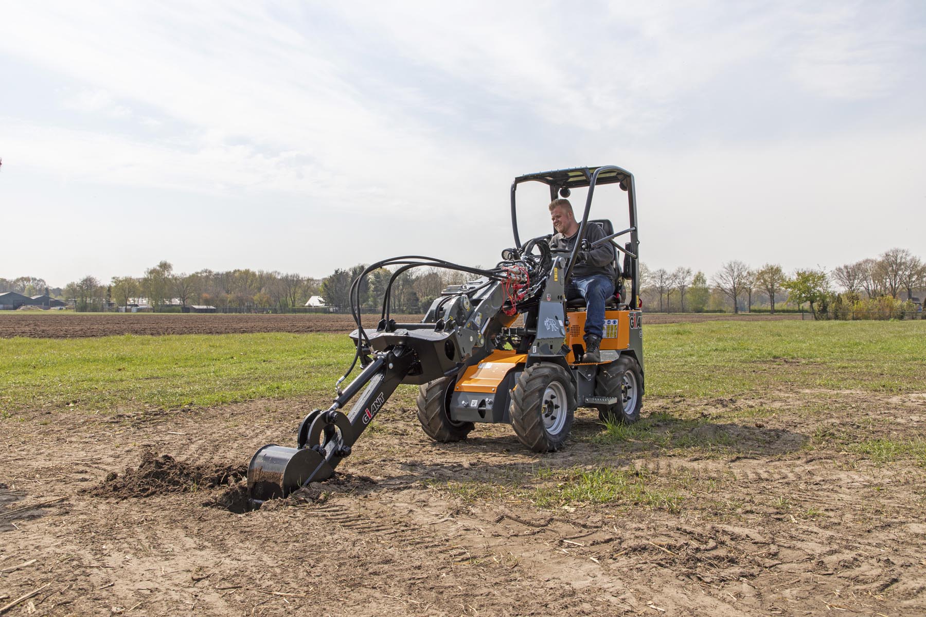 G1200 minishovel met een tele-arm voor een hefhoogte van 2,80 meter en hefkracht van 750 kg.